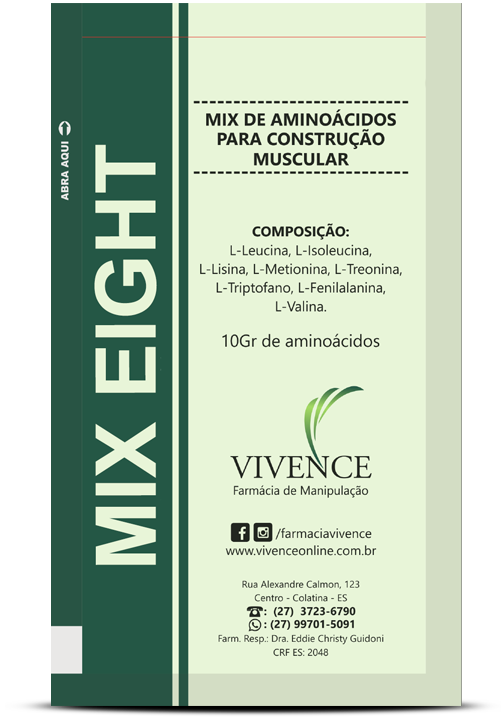 Mix Eight é um mix de aminoácidos essenciais com 99% de absorção: L-Leucina , L-Fenilalanina, L-Valina L-Treonina, L-Isoleucina, L-Metionina, L-Lisina e L-Triptofano.
